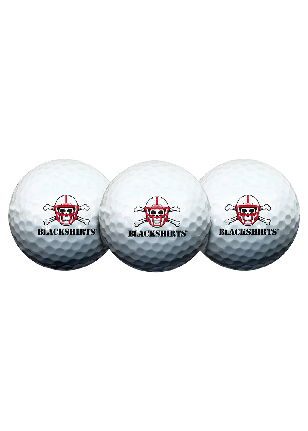 Golf ball pack contains three, durable cover, two-piece construction balls, printed with the Nebraska Husker "Blackshirts" logo. Officially licensed.