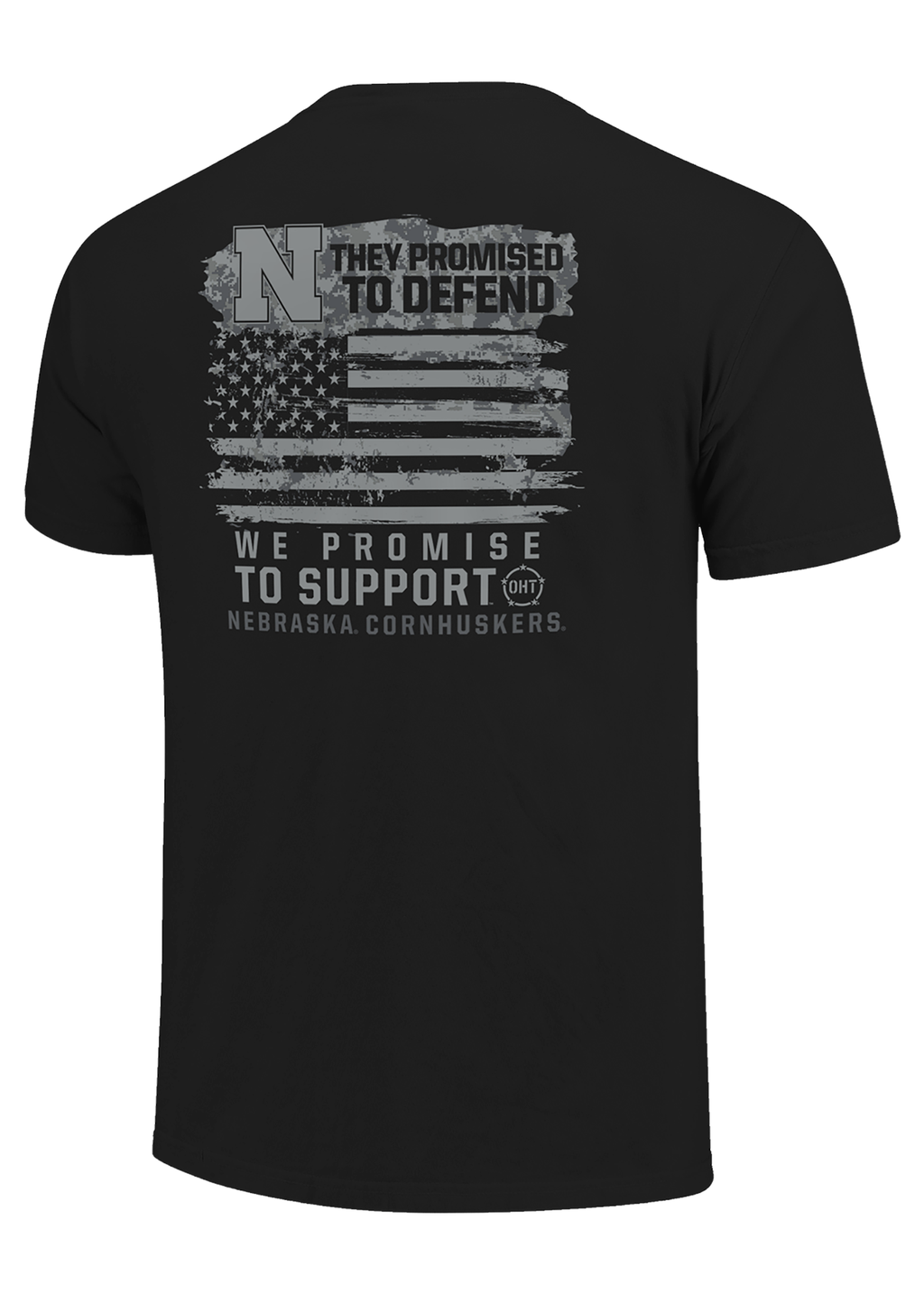 This patriotic OHT (Operation Hat Trick) tee combines Husker pride with a tribute to service. The front shows a rugged OHT patch-style logo. The back features a distressed U.S. flag graphic with the block N and the words: “They Promised to Defend. We Promise to Support – Nebraska Cornhuskers.”