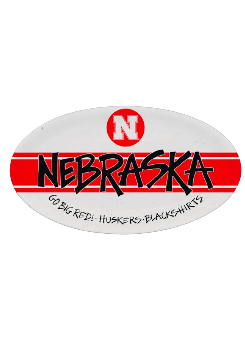 Oversized oval serving platter with a bold red center stripe, graffiti-style “NEBRASKA” lettering, and a circle “N” emblem—finished with “Go Big Red! Huskers. Blackshirts.” script along the bottom.