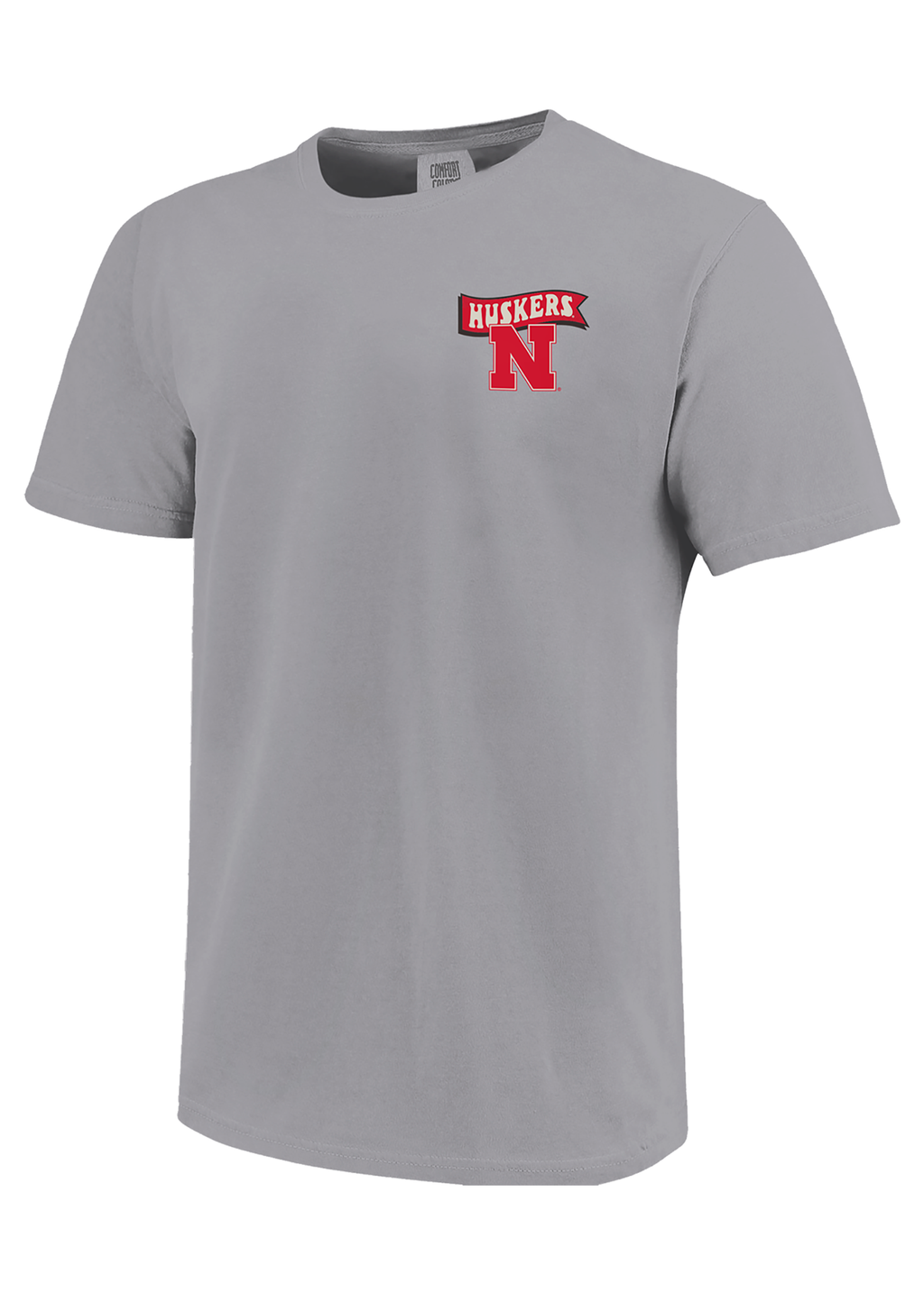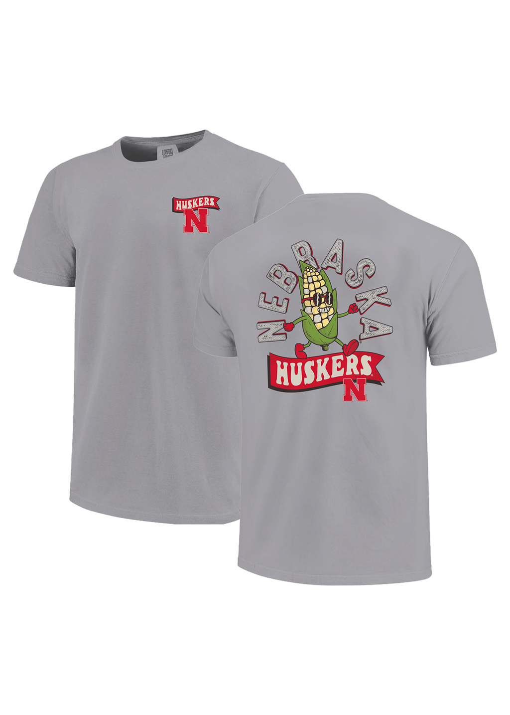 Bring some humor to your Husker gear with this playful tee. The front has a banner-style “Huskers” over the block N. The back features a cartoon ear of corn wearing sunglasses and running shoes, surrounded by “Nebraska Huskers” text and the block N.