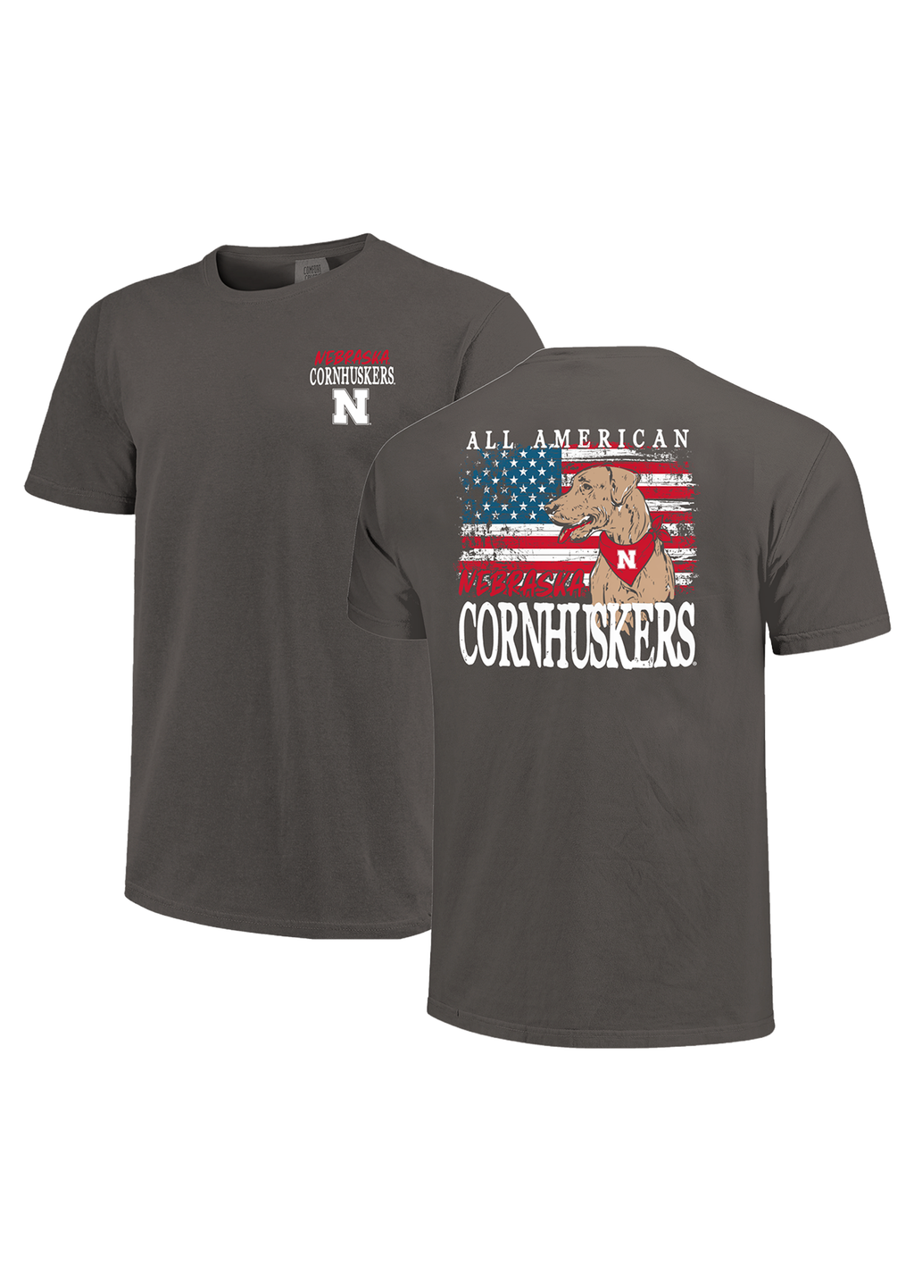 This fun Nebraska tee combines team pride with patriotic flair. The chest keeps it simple with “Nebraska Cornhuskers” and block N, while the back features a golden retriever wearing a Huskers bandana in front of an American flag with “All American Cornhuskers” text.
