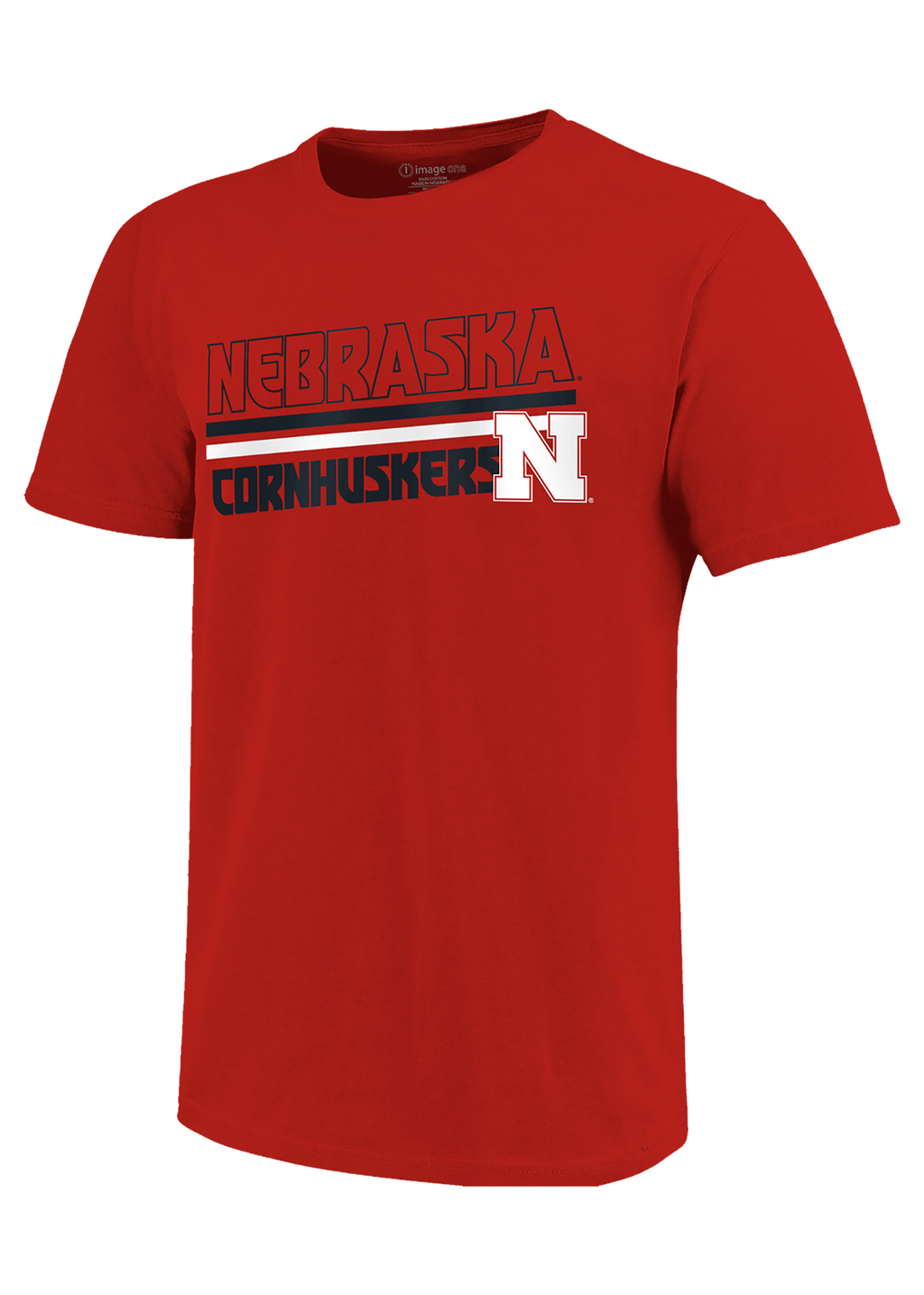 Front: “Nebraska Cornhuskers” text with black/white stripe design and block N logo