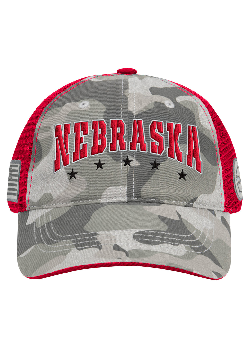 This camo OHT Nebraska snapback blends bold team spirit with military-inspired detail. The embroidered “Nebraska” arch lettering stands out in red across the front, paired with black stars for a clean finish. The red mesh back and adjustable closure add comfort and breathability, while OHT and flag patches on the sides tie in the cause.
