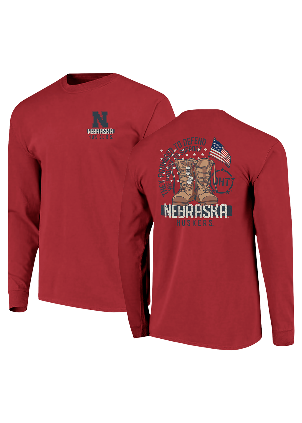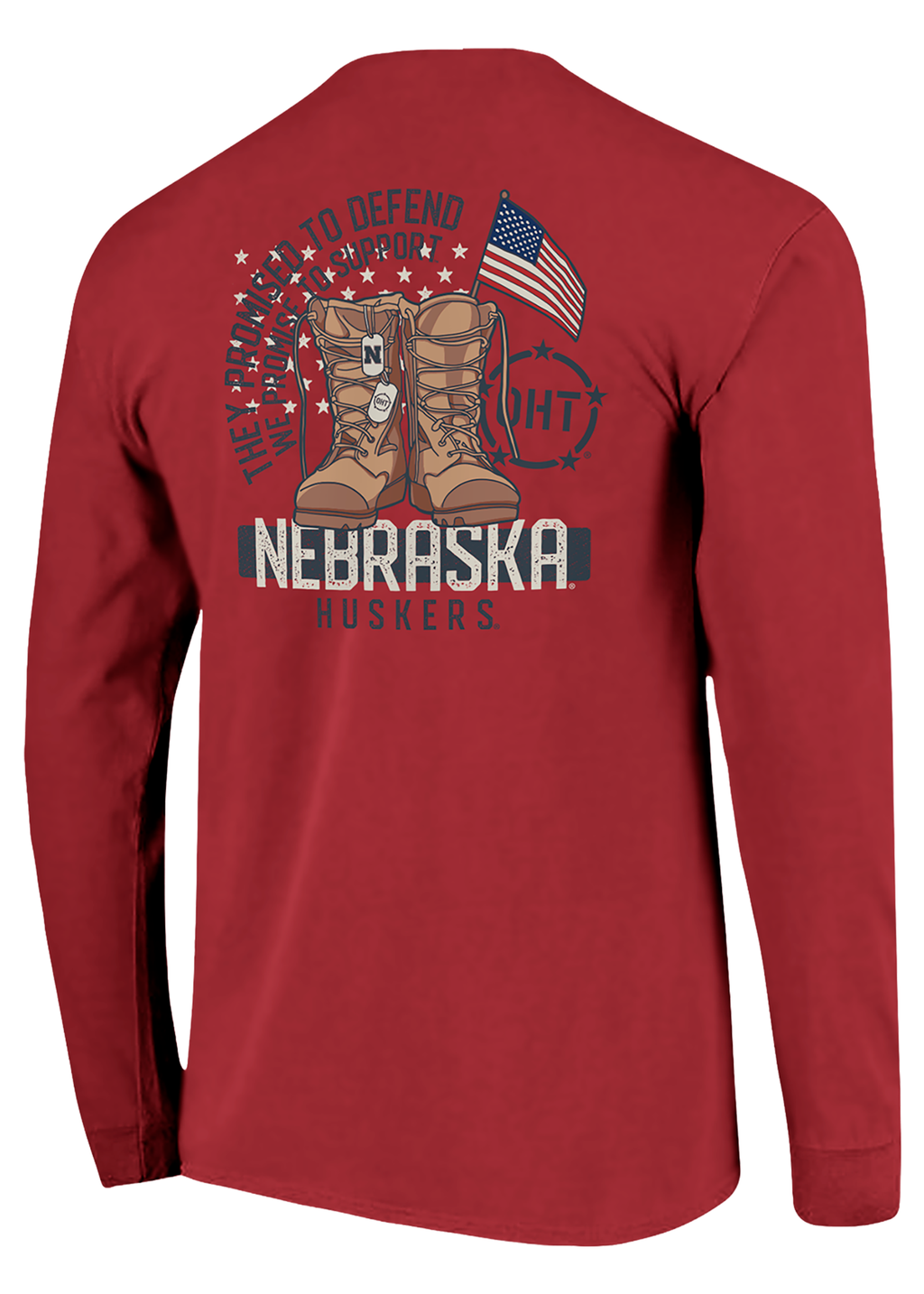 Show your Husker pride while honoring those who serve with this Operation Hat Trick (OHT) long sleeve tee. The front features a clean Nebraska “N” logo with “Nebraska Huskers” text, while the back showcases a powerful military-inspired graphic of combat boots, dog tags, and an American flag with the words “They Promised to Defend, We Promise to Support.”