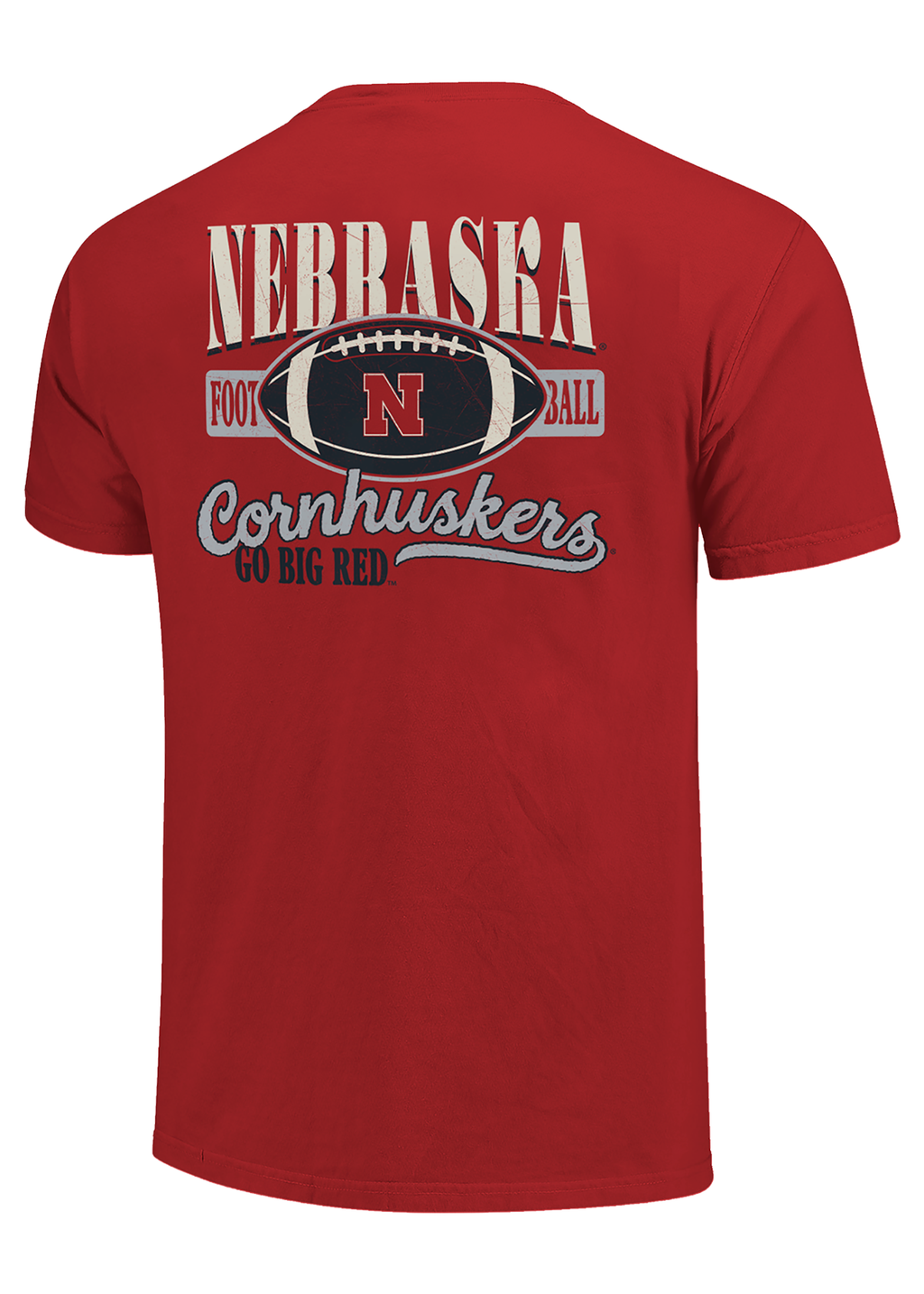 A vintage-style football tee for dedicated fans. The left chest has a small block N with “Nebraska Cornhuskers” text. The back showcases a large football graphic with “Nebraska Cornhuskers Football – Go Big Red” lettering, combining tradition with bold game-day style.