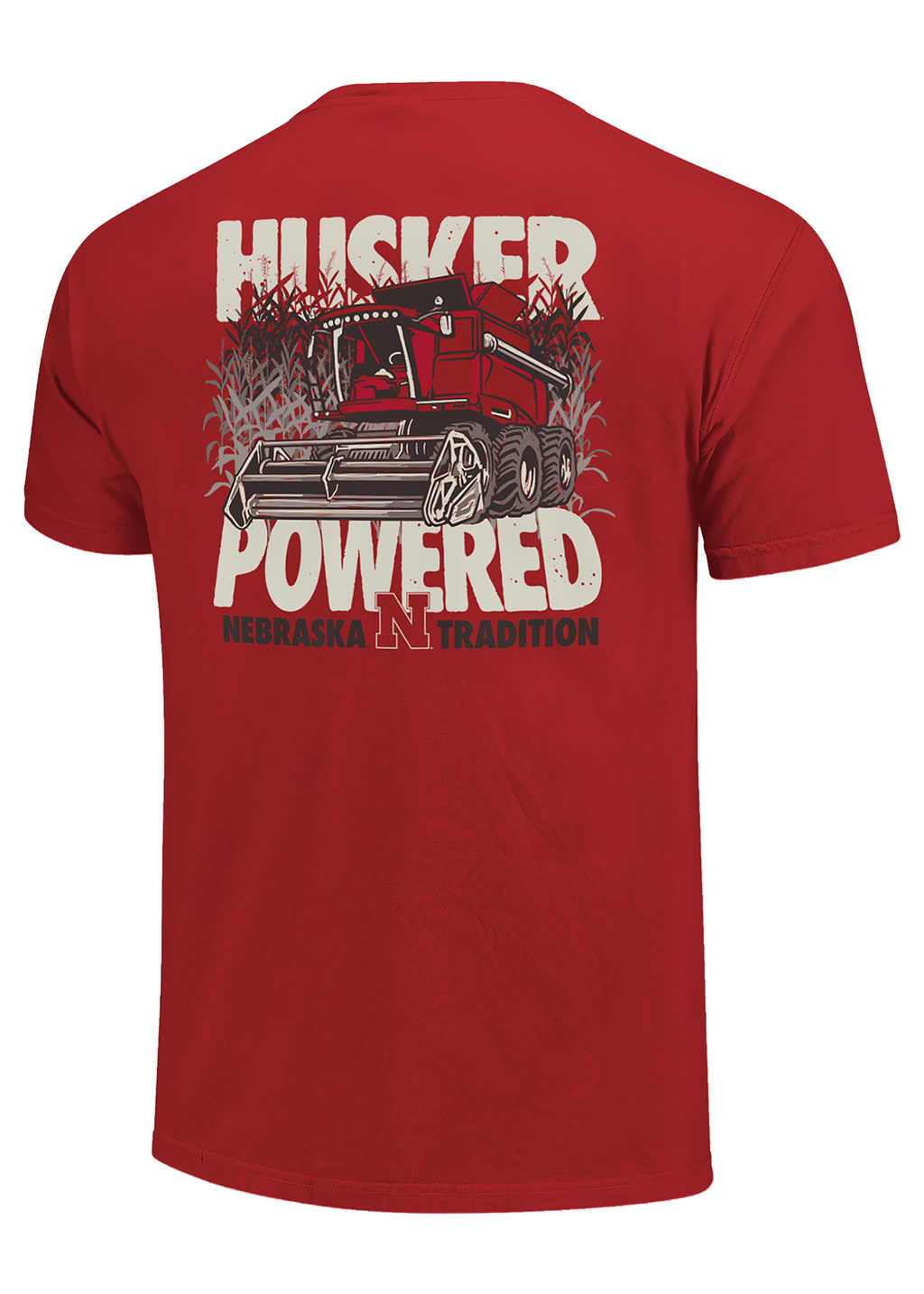 Highlight Nebraska’s farming roots with this unique design. The left chest features “Nebraska Huskers” text with the block N. The back graphic displays a red combine harvesting corn with the bold slogan “Husker Powered – Nebraska Tradition.”