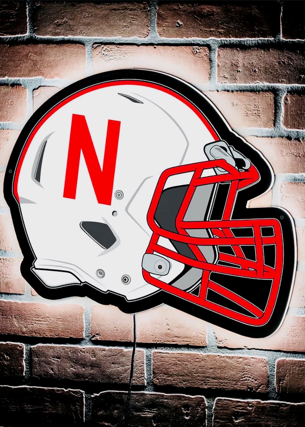 Die-cut wall sign in the shape of a white helmet with a bold red “N” and red facemask—finished with a clean halo glow that pops on brick, wood, or painted walls.
