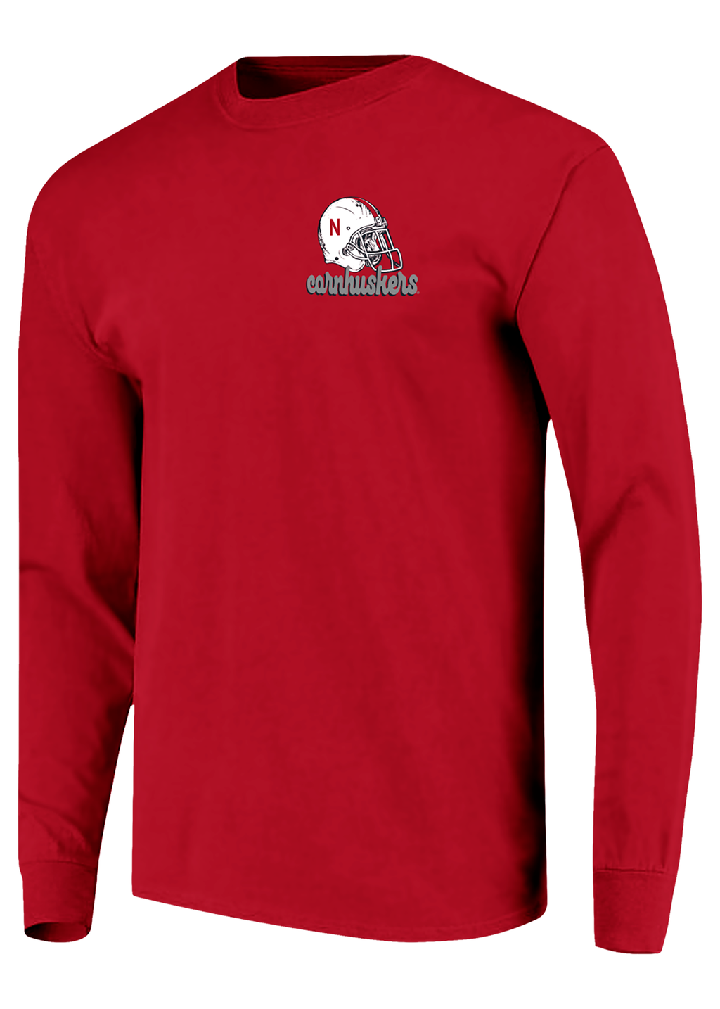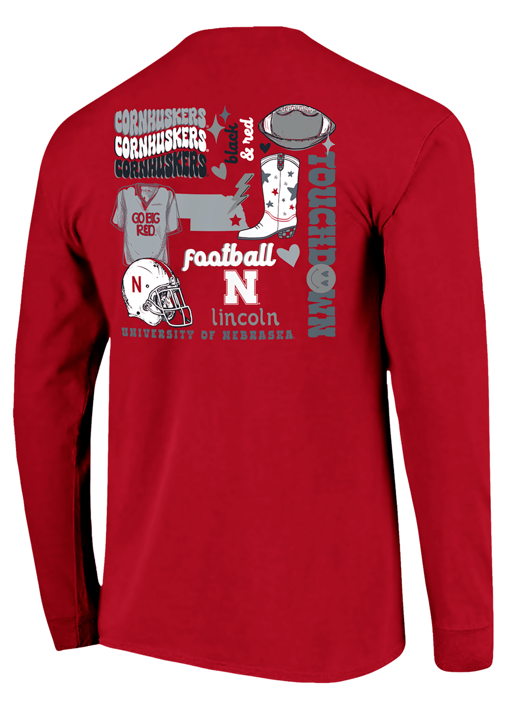 Show your Husker pride all season long in this women’s red long sleeve tee. The front features a small helmet graphic above “Cornhuskers,” while the back explodes with a bold football-inspired collage. Elements include repeating “Cornhuskers” text, football icons, a jersey illustration, “Touchdown,” “Go Big Red,” and the University of Nebraska name across the bottom. Made with a comfortable cotton blend, it’s the perfect choice for layering on chilly game days.