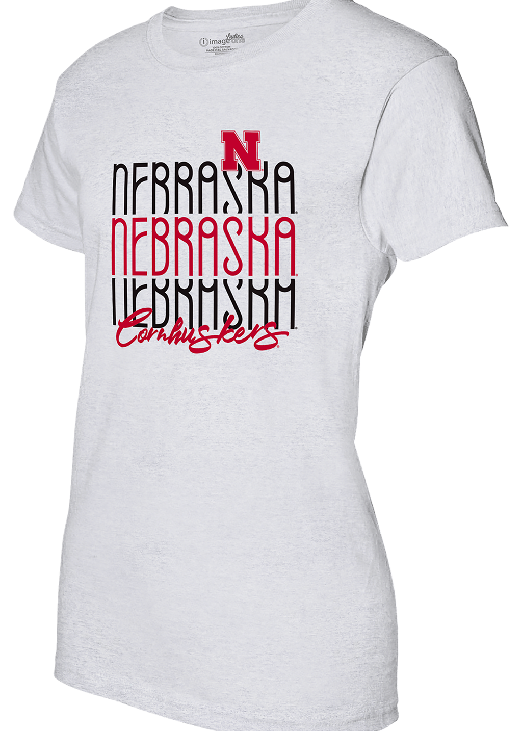 A trendy Husker look with a stacked text style. The front graphic features “Nebraska” repeated vertically in alternating black and red lettering, accented with a block N logo and “Cornhuskers” script across the bottom. The back is solid white for a clean finish.